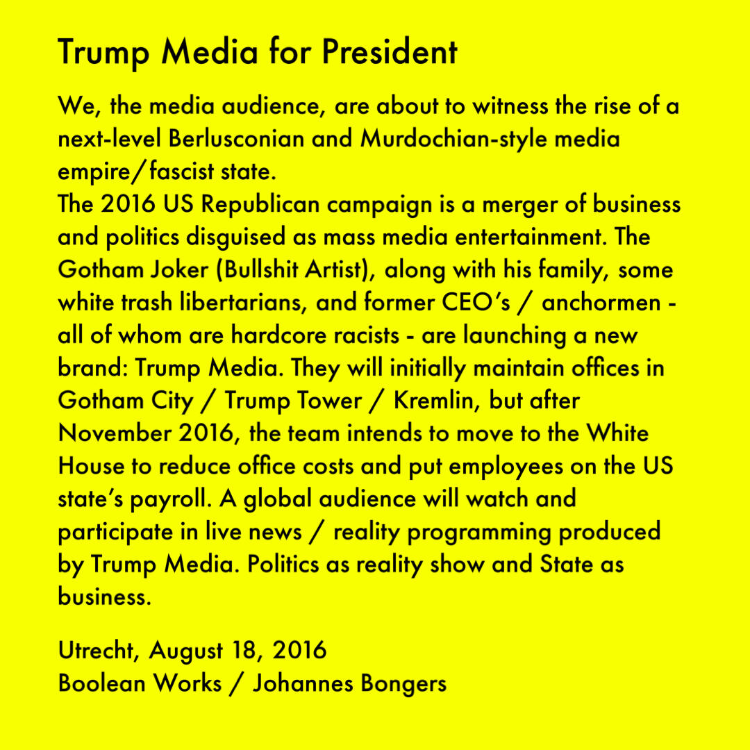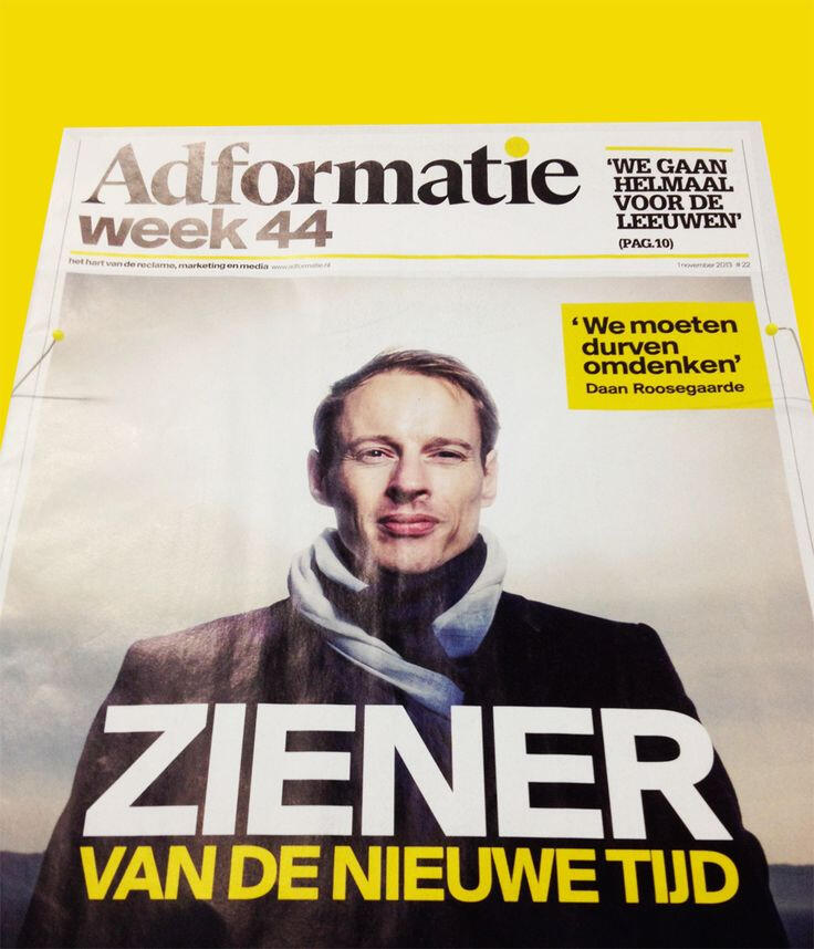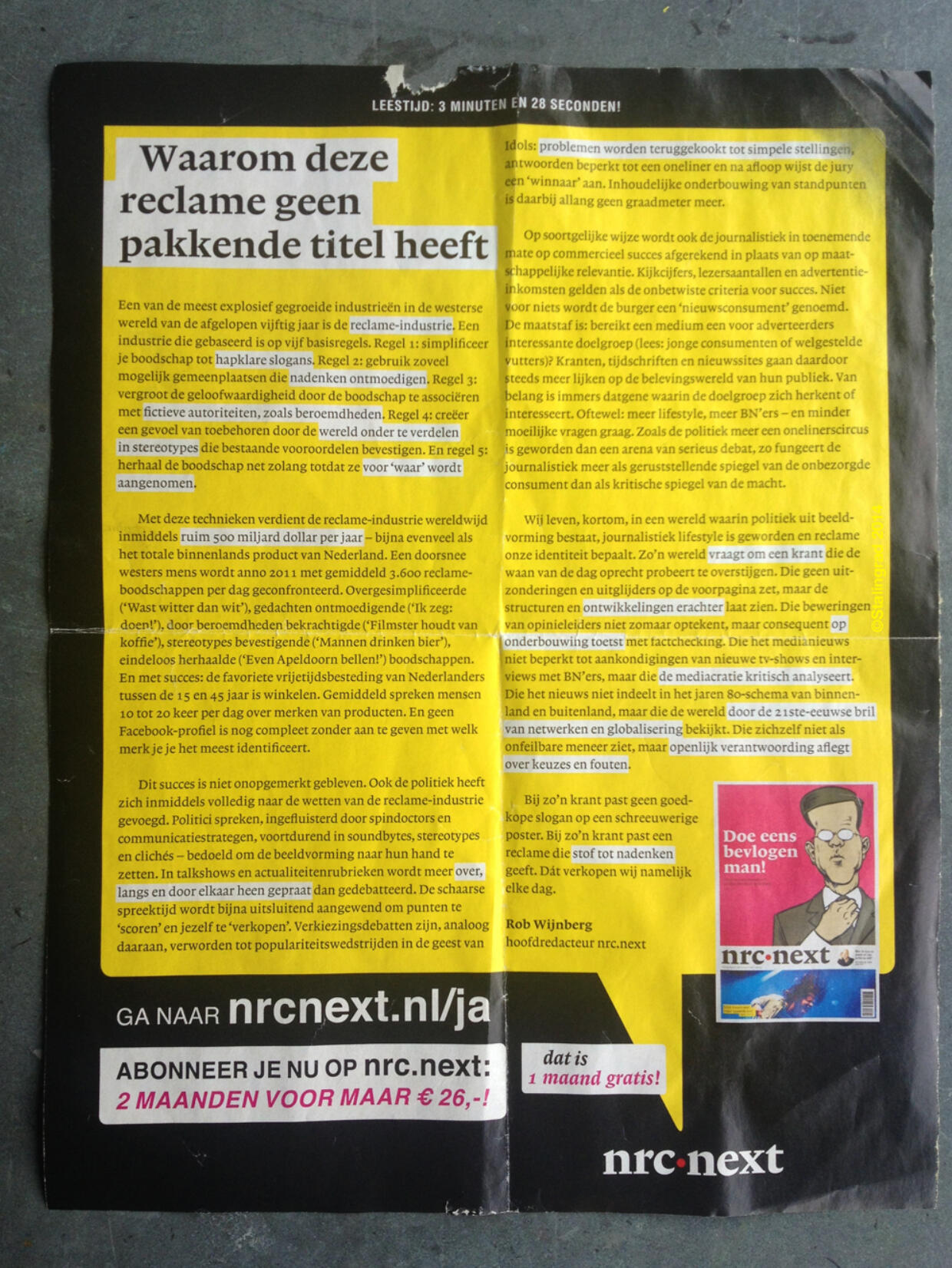 Vanaf 2010 verkenden we de kleur geel en verzamelden gele voorwerpen en fenomenen. We leerden het veelzijdige maar ongeduldige karakter van geel kennen. Een van de 'werken' was een reclame-uiting, een blad uit een tv-gids, dat een reclame is voor de toenmalige krant nrc-next. Met deze krant probeerde de hoofdredacteur Rob Wijnberg, die ook filosoof is, een ander nieuws-concept neer te zetten. NRC was toentertijd al onderdeel van een investeerder, nrc-next was een zakelijk experiment.Deze reclame, rijk aan informatie, laat perfect zien in welke loop we ons bevinden, in de loop van ideologie. Ideologie is kort gezegd het proces waarmee je het eigen wereldbeeld kloppend maakt, een wereldbeeld zonder tegenstrijdigheden. Je begrijp dan ook: hoe goed je je best ook doet, er is vervolgens niet aan te ontsnappen. De krant van Wijnberg is pure ideologie, en heeft alleen hierbinnen betekenis.De vorm van deze reclame - geel - valt samen met haar inhoud, of beter gezegd, deze reclame laat zien dat die twee niet van elkaar zijn te scheiden. Wat Rob Wijnberg niet wil weten is dat er een wereld buiten deze reclame mogelijk is, geeL Leeg, waarin wat hij schrijft kan worden ontmaskerd.Alleen door alles wat geel is te willen vertegenwoordigen, niet als reclame, niet als verzameling maar als kunst, kan geel een positie innemen buiten iedere ideologie. In onderstaande plaat laten we zien hoe deze gele wereld, rechts op de plaat, kan ontstaan.