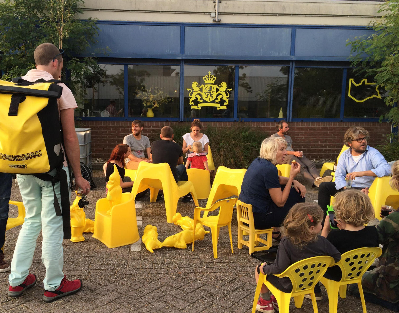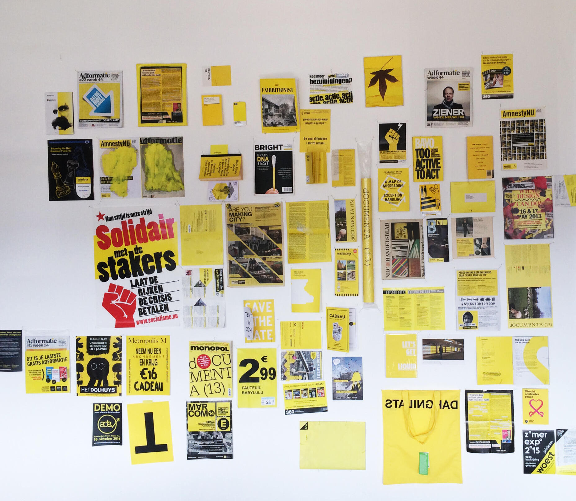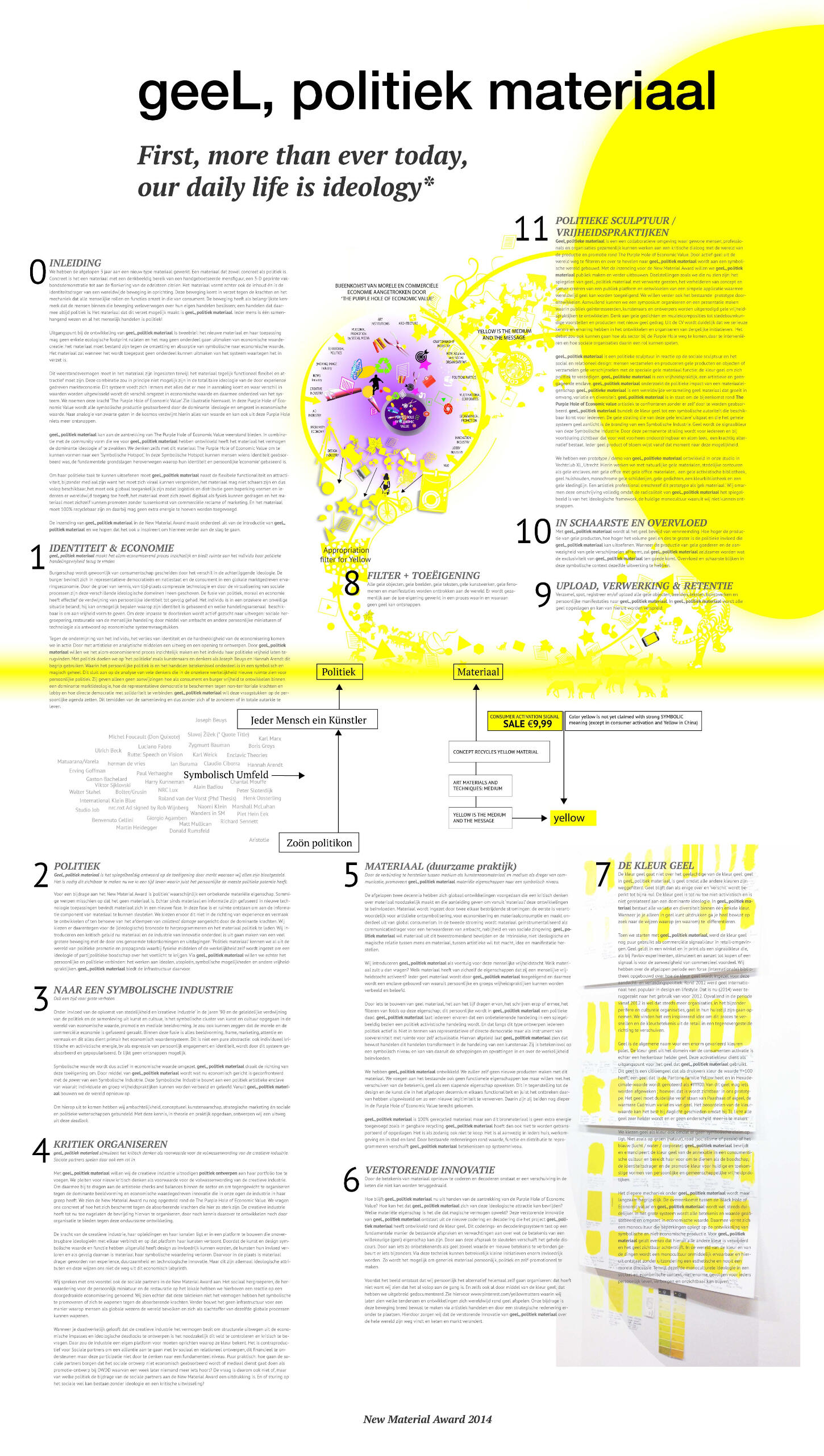 geeL Leeg kwam in een inhoudelijke versnelling toen we vanaf 2012 geel als politiek materiaal gingen definiëren. We probeerden geel de wereld van design en creatieve industrie in te smokkelen. Dit domein lijdt aan dezelfde kwaal waaraan nrc-next en andere concepten lijden. Deze sectoren hebben de kunst gekannibaliseerd en de symbolische waarde ervan overgeheveld naar het armoedige domein van waren en waarden, van de economie. Door geeL Leeg daar naar binnen te smokkelen probeerden we deze roof / operatie te openbaren en zo effectief ongedaan te maken.